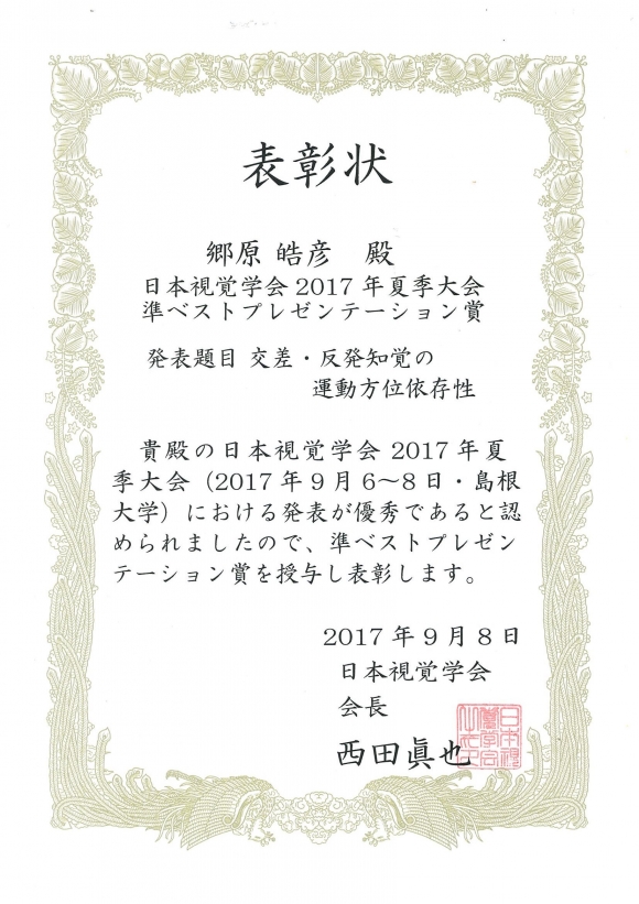 受賞名:日本視覚学会2017年夏季大会 準ベストプレゼンテーション賞