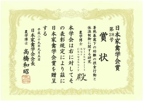受賞者 Vishwajit Sur Chowdhury 准教授 受賞名 日本家禽学会賞 受賞題目 暑熱暴露下の幼雛の摂食行動と体温制御に関する研究 受賞日 2017年9月5日