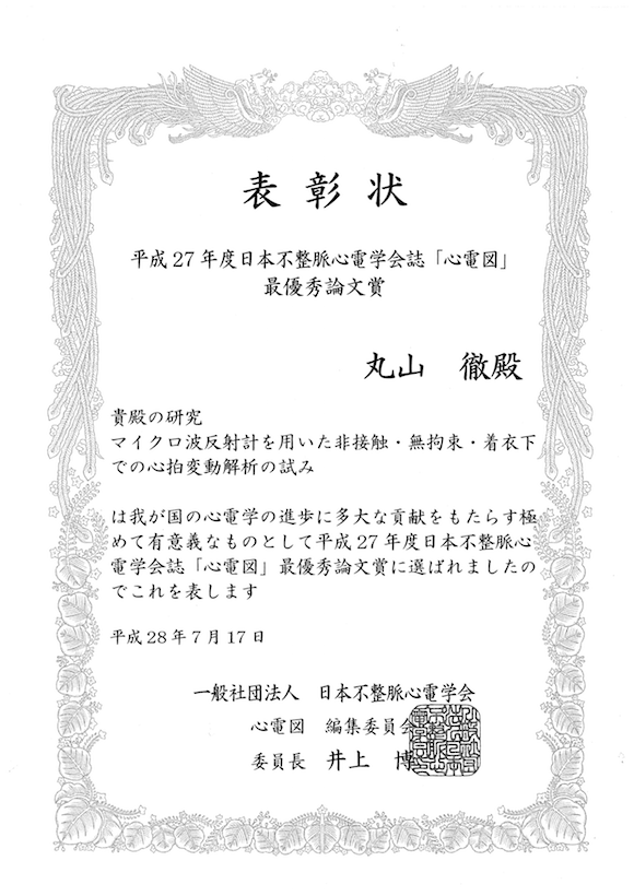 基幹教育院所属 丸山 徹教授が平成27年度日本不整脈心電学会誌「心電図」において最優秀論文賞を受賞されました