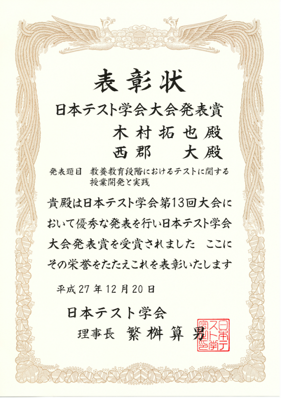 基幹教育院所属 木村拓也先生が日本テスト学会第13回大会において大会発表賞を受賞されました