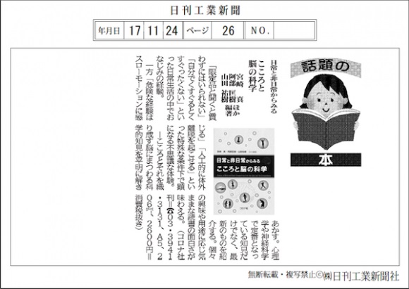 要約:編著した「日常と非日常からみる こころと脳の科学」が日刊工業新聞で紹介されました。