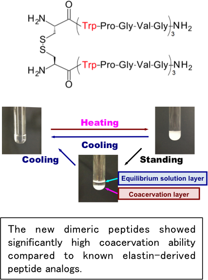 peptide dimers: (Cys-(Phe-Pro-Gly-Val-Gly)5)2 and (Cys-(Trp-Pro-Gly-Val-Gly)3)2. These dimers possess a high coacervation potential. Impressively, these novel dimeric peptides demonstrated coacervation at significantly lower concentrations and temperatures compared to commonly used elastin-derived peptide analogs. This suggests that the dimerization process enhances the peptides' coacervation ability. Building on these findings, we are in the process of developing more potent elastin-derived peptide analogs that combine both biological and chemical functionalities.