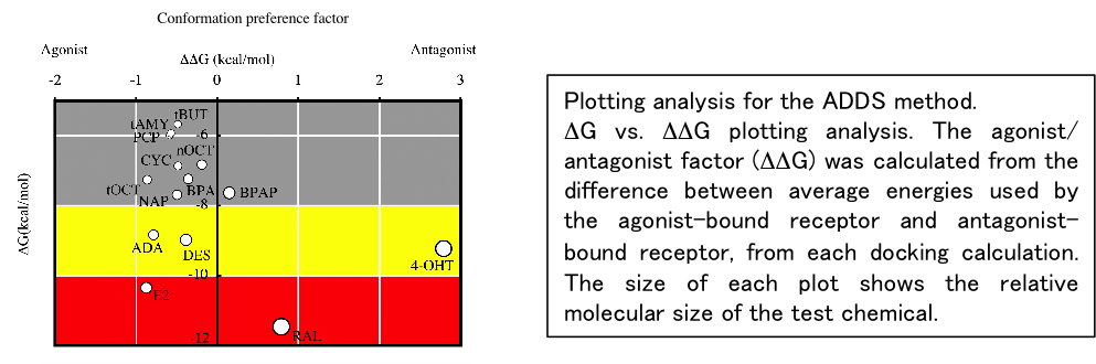 To address this, we introduced a novel screening approach, leveraging in silico docking calculations. Utilizing the crystal structures of both agonist-bound and antagonist-bound LBDs as templates, we estimated binding energies to differentiate between agonist and antagonist binding. This method, termed agonist/antagonist differential-docking screening (AADS), not only predicts the binding capability but also the agonist/antagonist function of chemicals for the target NRs.