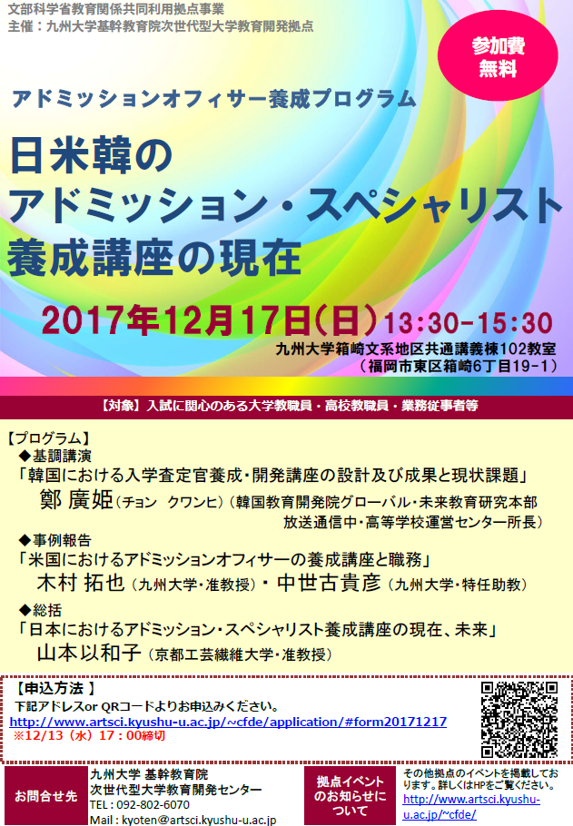 平成29年12月17日(日)アドミッションオフィサー養成プログラム「日米韓のアドミッション・スペシャリスト養成講座の現在」を開催しました。今回のシンポジウムの基調講演では、韓国から鄭廣姫先生をお招きし、韓国における入学査定官養成・開発講座の状況についてご講演頂きました。また、中世古貴彦先生からは事例報告として、米国のアドミッションオフィサー講座の概要と人材募集についての計量分析結果の発表がありました。最後には、鄭先生の基調講演、中世古先生の事例報告を受けて、山本以和子先生から日米韓におけるアドミッション・スペシャリスト養成講座の現在と未来についての総括があり、本シンポジウムは締めくくられました。