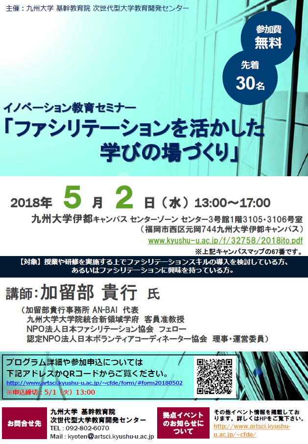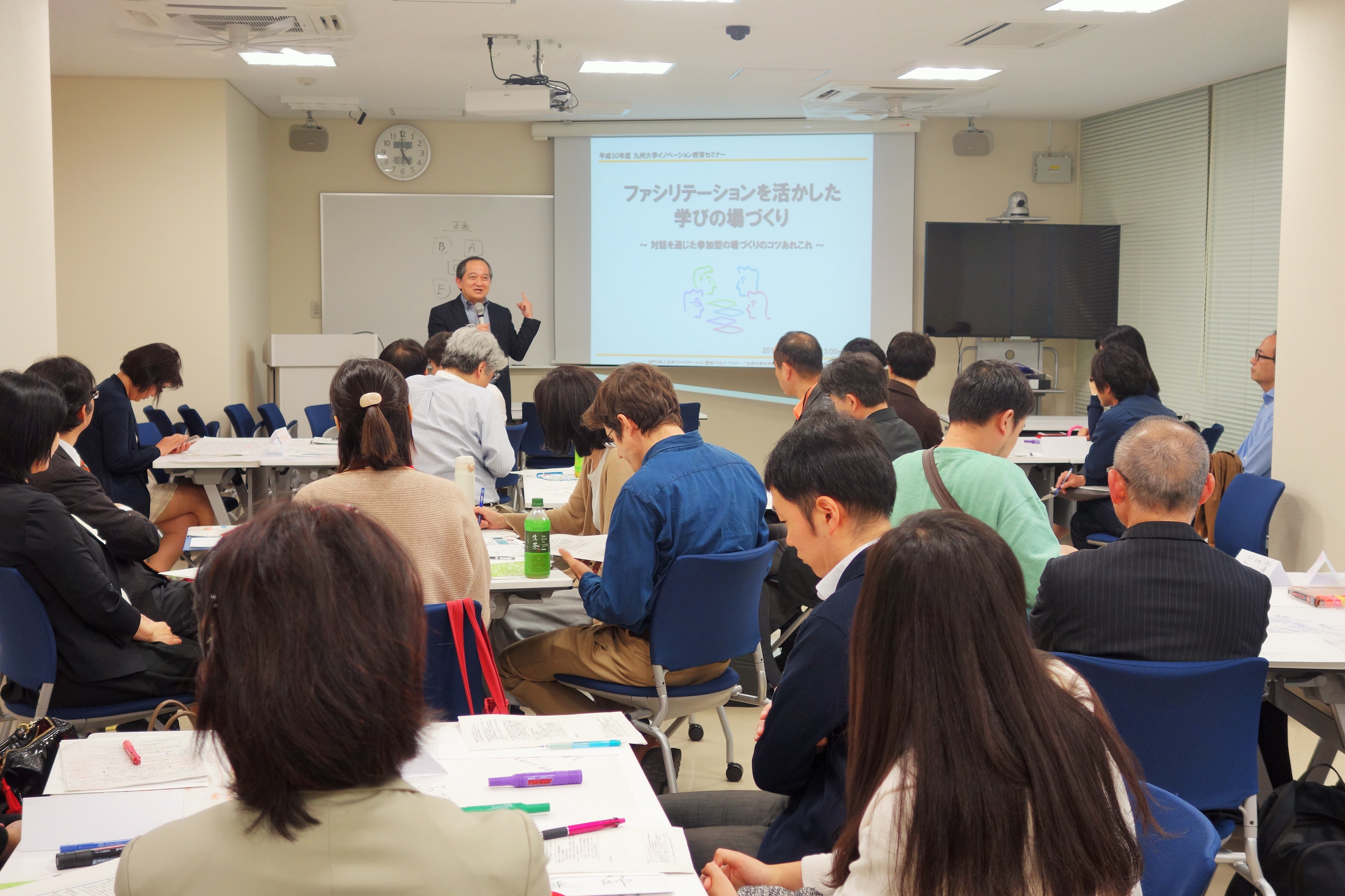 平成30年5月2日(水)イノベーション教育セミナー「ファシリテーションを活かした学びの場づくり」を開催しました。授業や研修のみならず多くの場面で教員と学生、講師と受講生との間でインタラクティブな関係を築きつつ教育を展開することが求められています。場づくりや展開のプロセスといった授業デザインにおいては、ファシリテーションスキルを活用することが学生や受講生の理解度や納得感を高めるためにも必要な要素になります。今回のセミナーでは、ファシリテーションの基礎のみならず、授業や研修の現場で、どのようにファシリテーションスキルを導入し効果を高めることが出来るのか、そして、そのための場づくりや授業デザインをどのように行うのかといった点を講義と演習を通して学びました。