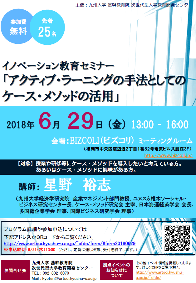 平成30年6月29日(金)イノベーション教育セミナー「アクティブ・ラーニングの手法としてのケース・メソッドの活用」を開催しました。今回はアクティブ・ラーニングの手法としても注目を集めているケース・メソッドについて、「自動車メーカーA社の海外戦略」と「初めてのケース・ディスカッション」という2つの短いケースを用いて学びました。また、ケースを活用した授業・研修を行う際に気をつけることや、ケース・リーダーとしての講師はどのような役割を担うのかといった基本的な観点についても議論を通して理解を深め合いました。