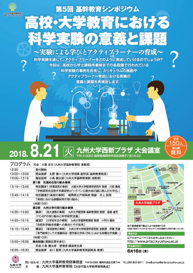 平成30年8月21日(火)第5回 基幹教育シンポジウム「高校・大学教育における科学実験の意義と課題-実験による学びとアクティブラーナーの育成-」を開催しました。今回は、自然科学分野の実験に焦点を当て、科学実験を通じた教育の多様な取り組みを共有し、教育改善の可能性を探りました。シンポジウムでは、高校から学士課程卒業時までの各段階で、実験による教育がどのようなねらいと方法で実施されているのか、学外の先進的な取り組みも交え、複数の事例を共有しました。総合討論では、事例紹介に対する参加者からの質問を基に、カリキュラムの接続やアクティブラーナー育成における実験の意義と課題について再検討しました。