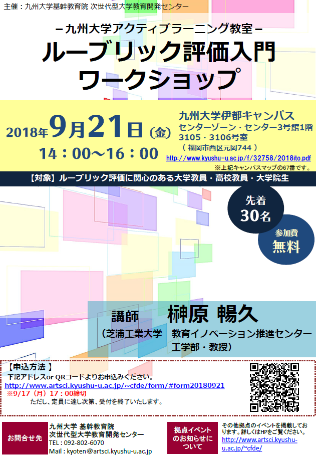 平成30年9月21日(金)に九州大学アクティブラーニング教室「ルーブリック評価入門ワークショップ」を開催しました。「何を教えたか」から「何を学んだか」という高等教育におけるパラダイム転換の必要性が指摘されて以降、現在の大学教育では、成績評価についても多様な評価基準を設定することが求められています。このような現状を鑑み、今回の九大AL教室では、成績評価の手法として近年注目が集まっているルーブリックを用いた評価について取り上げました。ルーブリックを用いた評価の基本的な考え方や活用方法を、講義とルーブリック評価表の素案作成ワークショップを通して学びました。