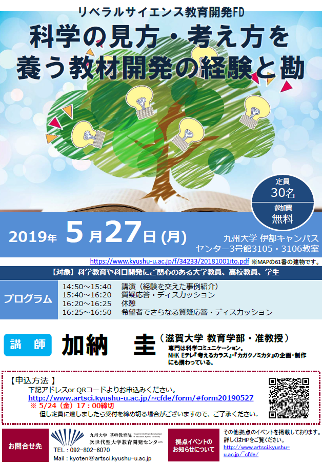 令和元年5月27日(月)にリベラルサイエンス教育開発FD「科学の見方・考え方を養う教材開発の経験と勘」を開催しました。今回のFDでは、NHK Eテレ『考えるカラス』や『カガクノミカタ』の企画・制作、そして、それらと連動させた親子向けワークショップなどの「科学の見方・考え方」に焦点を当てた教材および教育プログラム開発に携わってきた加納圭先生をお招きしました。FDの前半は、加納先生のこれまでの経験を講演をして頂き、その後には、講演内容を基に科学の考え方を養うための教材や科目開発について、質疑応答とディスカッションを行いました。