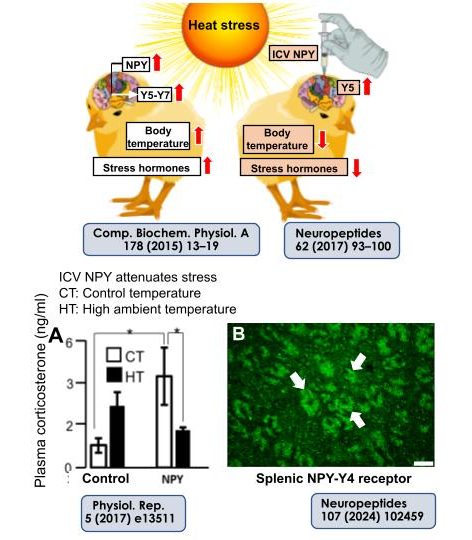 Brain neuropeptides are involved in regulation of various physiological functions including food intake, stress response, thermoregulation, etc. Previously, we found that the brain neuropeptide Y (NPY) mRNA expressions were increased in chicks under heat stress (Ito et al., 2015). Central injection of NPY caused to reduce physiological stress (Bahry et al., 2017) and attenuated cellular heat stress response in the spleen (Nishimura et al., 2022) in heat-exposed chicks. Recently, we have reported that NPY-Y4 receptor expression was increased in the spleen in response to high ambient temperature in male chicks (Nishimura et al., 2024). These results suggest that NPY is a hormone that reduces the stress response under heat stress.