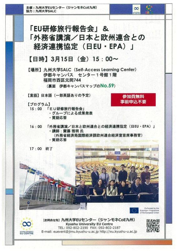 このイベントは、九州大学のEUセンターとその活動についてもっと知る機会になります。興味深い発表と講演があります。ゲストが質問をする機会もあります。(参加するために予約する必要はありません!) イベントに興味があり、EUについてもっと知りたいのであれば、下のポスターをチェックしてください。
