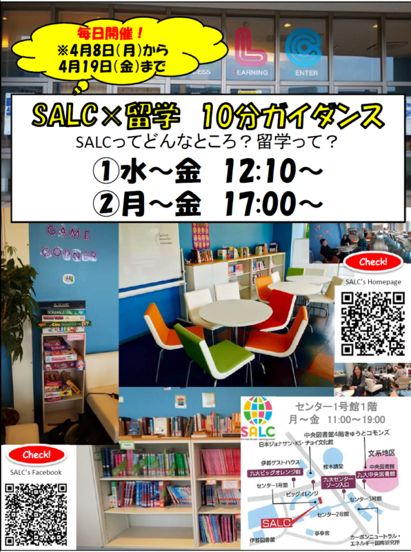 SALCは4月8日から4月19日までガイダンス・セッションを行うことを計画しています。 SALCについてもっと学んだり、あるいは海外で勉強したり働いたりすることに関心があれば、必ず立ち寄ってください!学生さんが質問をする機会もあります。イベントに興味があり、留学についてもっと知りたいのであれば、下のポスターをチェックしてください。