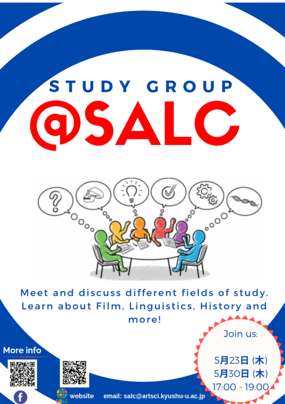 勉強会 @ SALC(平成31年度前期) 2019/05/02 今学期のSALCのティーチング・アシスタント(九州大学大学院生)は、映画、言語学、歴史、経済学、そしジェンダーなどの様々な興味深い話題に関する勉強会を担当します。イベントの詳細については、以下のポスターをご覧ください。