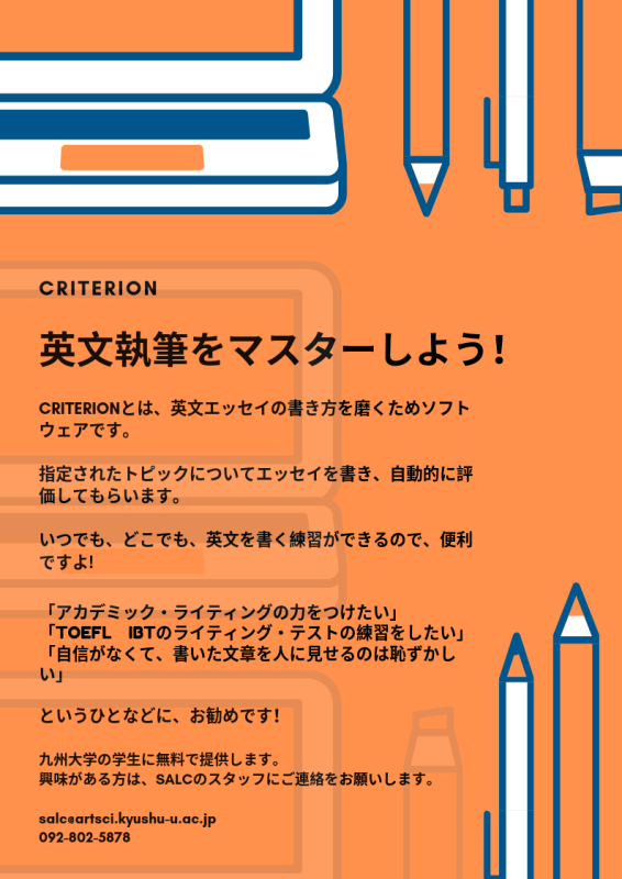 Criterion とは、英文エッセイの書き方を磨くためソフトウェアです。指定されたトピックについてエッセイを書き、自動的に評価してもらいます。英語の文章を上達させたい学生にとって非常に便利です。九州大学の学生に無料で提供します。興味がある方は、SALCのスタッフにご連絡をお願いします。