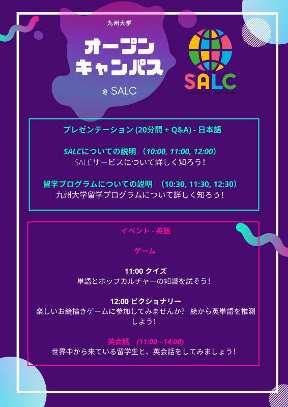 今年のオープンキャンパスがオンラインで開催されることをご存知ですか? SALCは8月1日と2日に九州大学のオンラインオープンキャンパスに参加します。イベントの詳細については、ポスターをご覧ください。