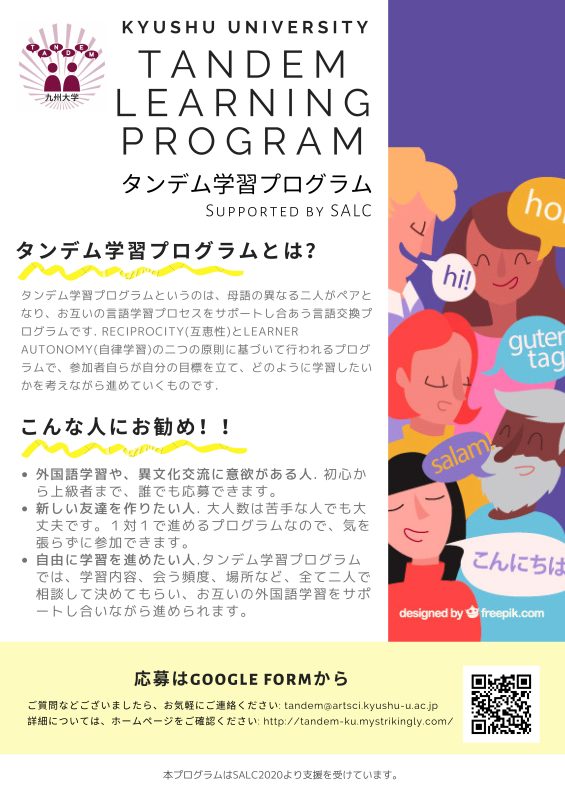 タンデム学習プログラム – インドネシア語またはタイ語の学習に興味がありますか? 2020/10/29 今学期は、留学生 と一緒にインドネシア語やタイ語を学ぶ機会があります。プログラムに参加して友達を作り、新しい言語を学びましょう!