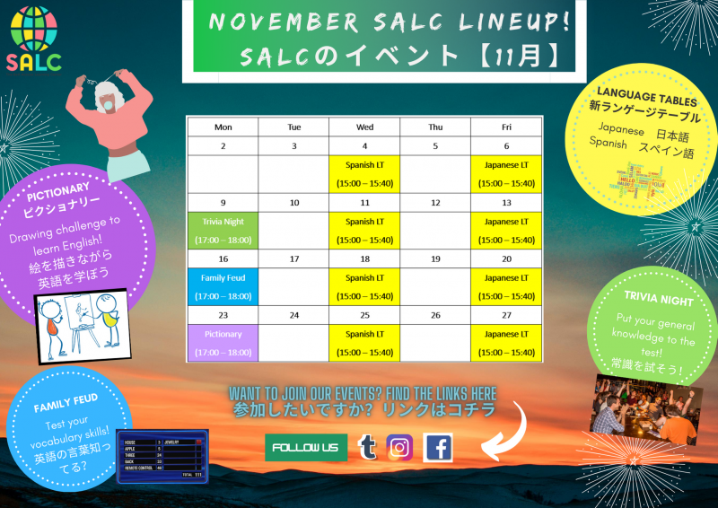 SALCは11月に色んなのオンラインイベントを開催します。詳細については、ポスターをご覧ください!
