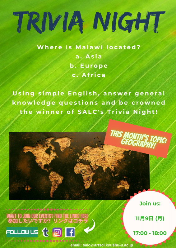 SALC – トリビア・クイズ – (令和2年11月) 2020/11/04 SALCのトリビア・クイズに参加して、一般的な知識と英語力をテストしてください!11月のクイズに参加することに興味があれば、ポスターをチェックしてください。