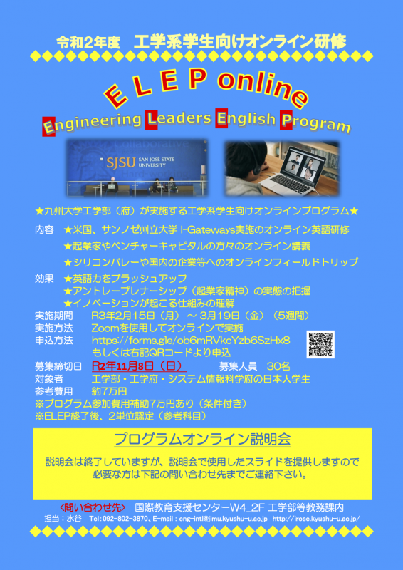 ELEP (Engineering Leaders English Program) – ELEP Online – 工学系学生向けオンライン研修 - 九州大学工学部(府)が実施する工学系学生向けオンラインプログラム! 募集締切日:冷和2年11月8日(日)