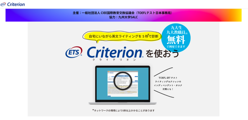 Criterion – 九大生向けウェブサイト 2020/11/16 Criterionについて聞いたことがありますか?Criterionとは、英文エッセイの書き方を磨くためソフトウェアです。新しい九大生向けウェブサイトが作成されました。詳細については、ウェブサイトをご覧ください。 https://www.cieej.or.jp/toefl/criterion/kustudent