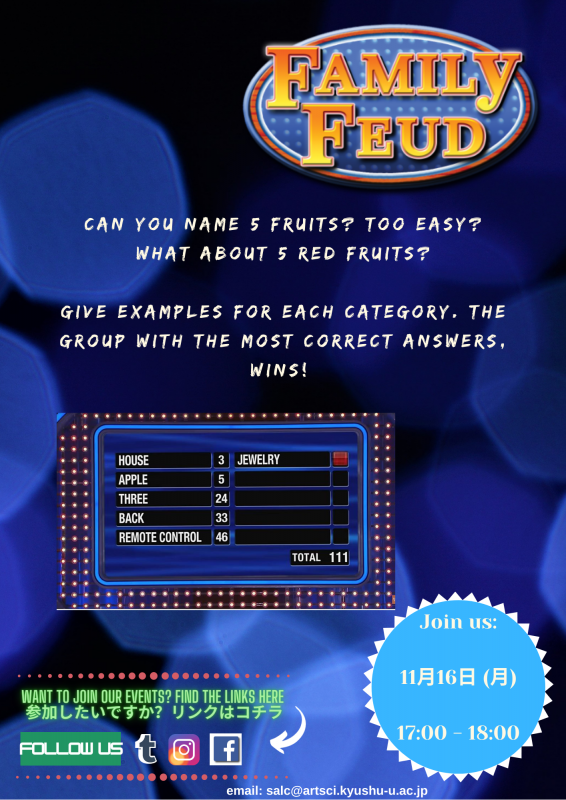 今学期中、 Family Feud (クイズ100人に聞きました) というゲーム が月に一度行われます。このイベントは一般的な知識をテストし、英語を練習する機会を与えます。Family Feudはどの様にプレーしますか。各カテゴリの例を挙げて、最も正解したグループが勝ちます!是非、参加してください! Moodle: https://moodle.s.kyushu-u.ac.jp/course/view.php?id=29773