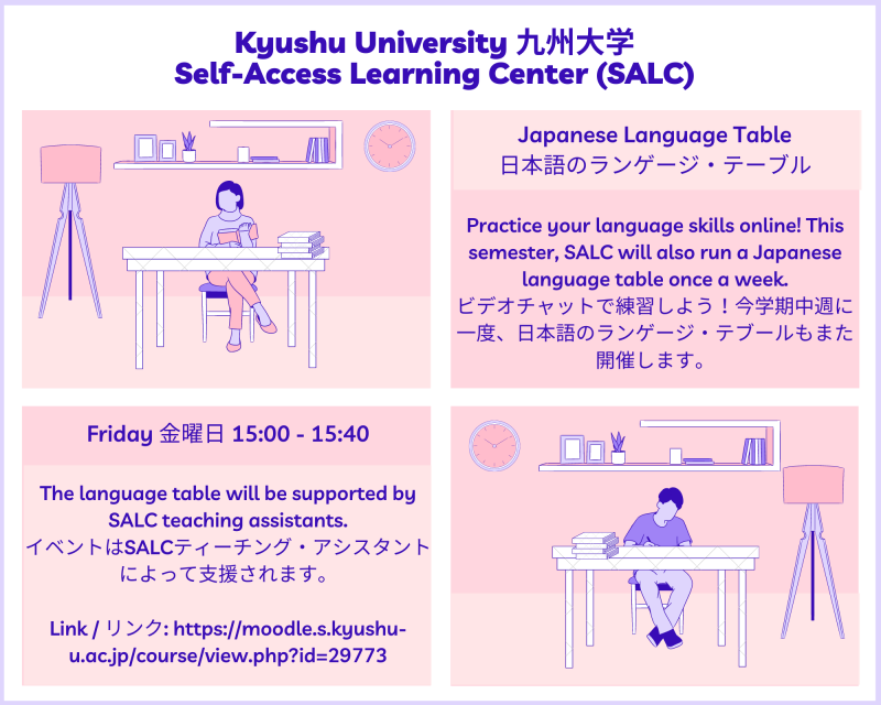 日本語 のランゲージ・ テーブル – 12月 2020/12/02 ビデオチャット で練習しよう!今学期中週に一度、日本語のランゲージ・テブールもまた開催します。リンク: https://moodle.s.kyushu-u.ac.jp/course/view.php?id=29773