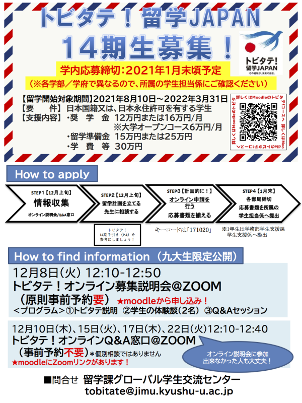 トビタテ!留学 JAPAN 第14期募集 2020/12/14 トビタテ!は、文部科学省および日本学生支援機構が企業等との連携により、意欲的な体験活動を行う目的で海外に留学する日本人学生を支援する奨学金制度です。学内応募締切:2021年1月末頃予定 / リンク:https://moodle.s.kyushu-u.ac.jp/course/view.php?id=33108