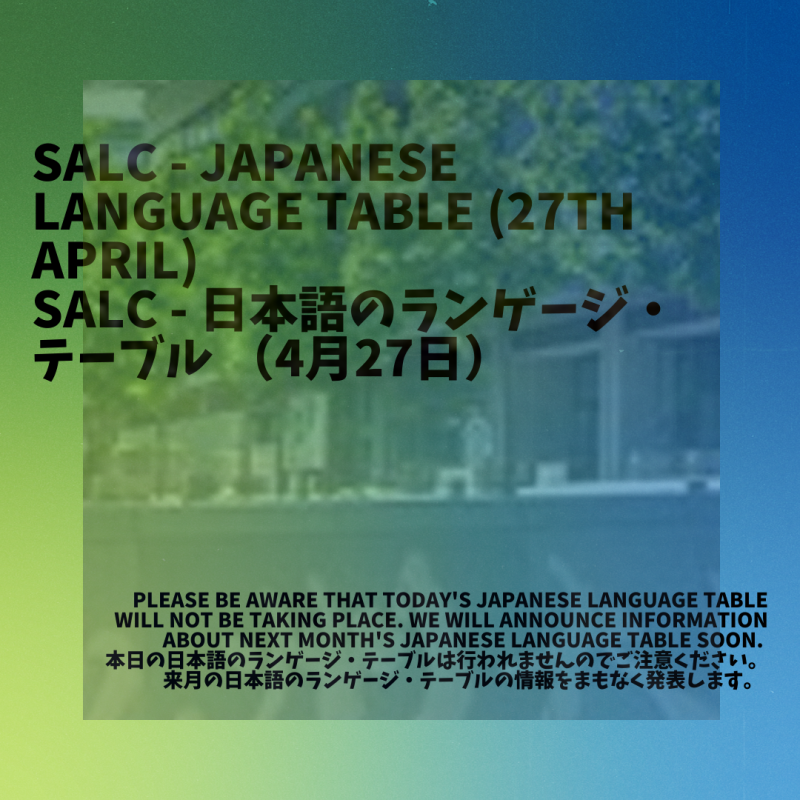 SALC – 日本語のランゲージ・テーブル (4月27日) 2021/04/27 本日の日本語のランゲージ・テーブルは行われませんのでご注意ください。来月の日本語のランゲージ・テーブルの情報をまもなく発表します。
