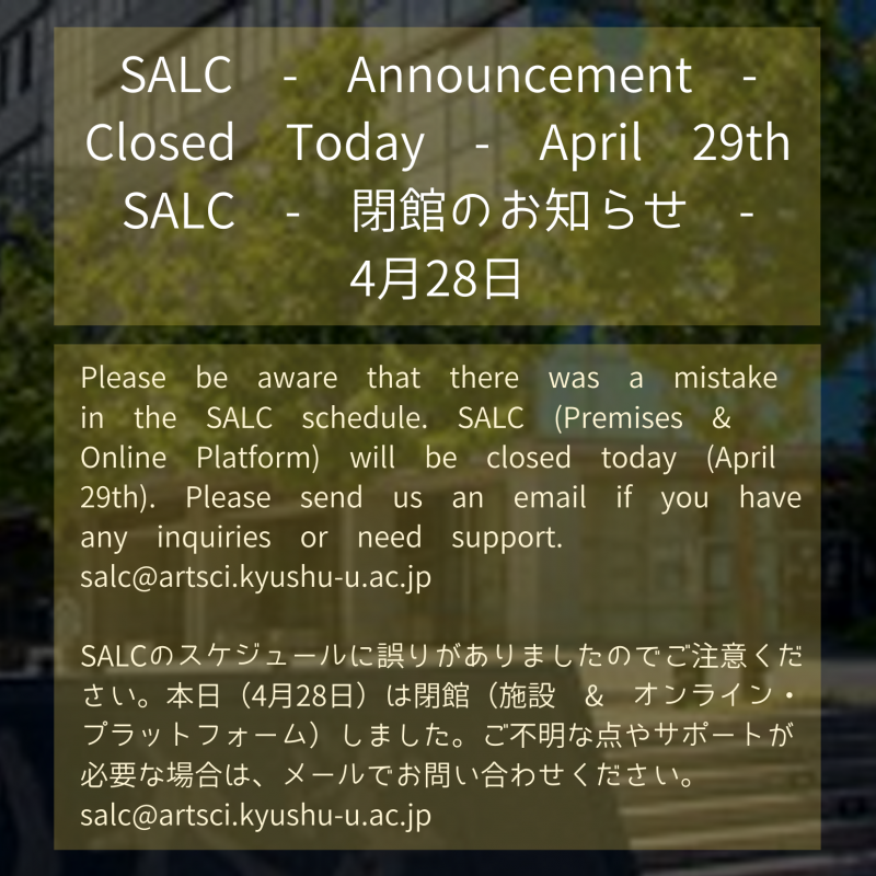 SALCのスケジュールに誤りがありましたのでご注意ください。本日(4月28日)は閉館(施設 & オンライン・プラットフォーム)しました。ご不明な点やサポートが必要な場合は、メールでお問い合わせください。salc@artsci.kyushu-u.ac.jp