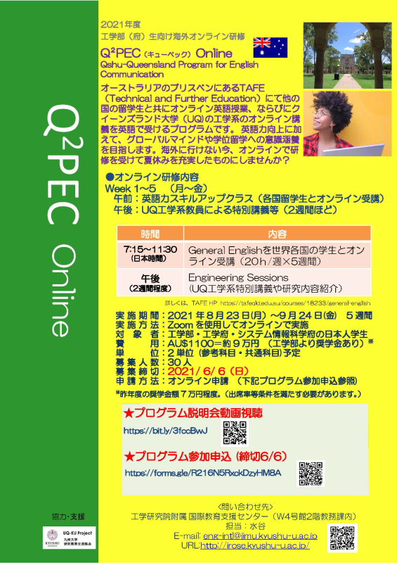 オンライン留学Q2PEC(オーストラリア)- 募集中! 2021/05/28 Q2PECというプログラムに興味があれば、ポスターをチェックしてください!募集締切:2021年6月6日 ・ 実施期間:2021年8月23日 ~ 9月24日