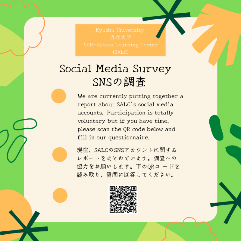 現在、SALCのSNSアカウントに関するレポートをまとめています。調査への参加は自由です。以下のリンクをたどって、質問に記入してください。この調査は匿名であり、完了するのに約1分しかかかりませんので、時間があれば、ご協力お願い致します。リンク:https://docs.google.com/forms/d/1ji9fS1Kmofjd-zSQyM1UVhsbXl7DPQB3Jv8MDIzTeEg