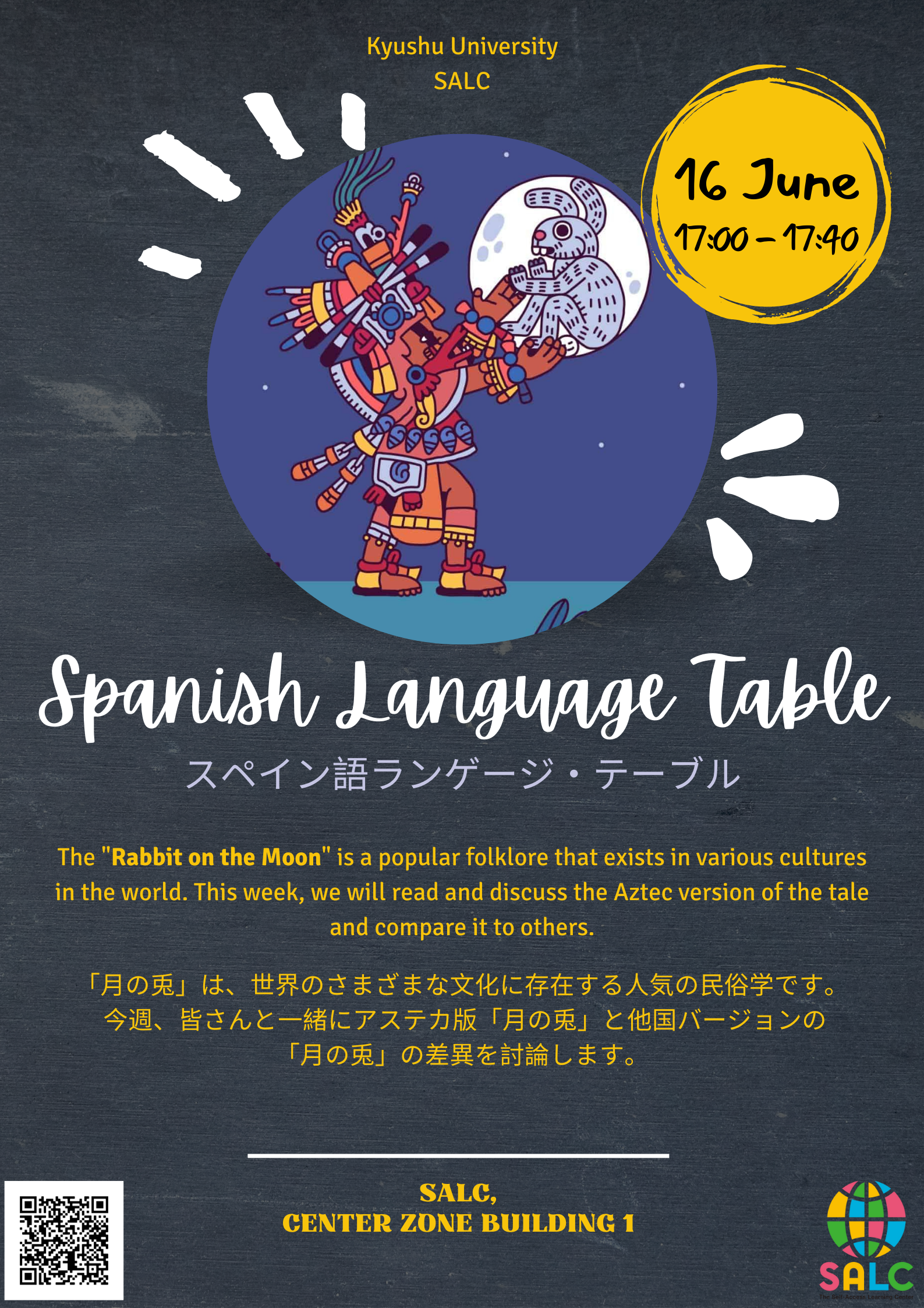 スペイン語ランゲージ・テーブル 2022/06/15 「月の兎」は、世界のさまざまな文化に存在する人気の民俗学です。 今週、皆様と一緒にアステカ版「月の兎」のと他国バージョンの「月の兎」差異を討論します。 初心者からネイティブスピーカーまで、あらゆるレベルの方でも歓迎します! QRコードを使用して登録します。 今週の木曜日是非ご参加ください! SALCで会いましょう~ リンク: https://forms.gle/eGnTH2cQAgDm777L7