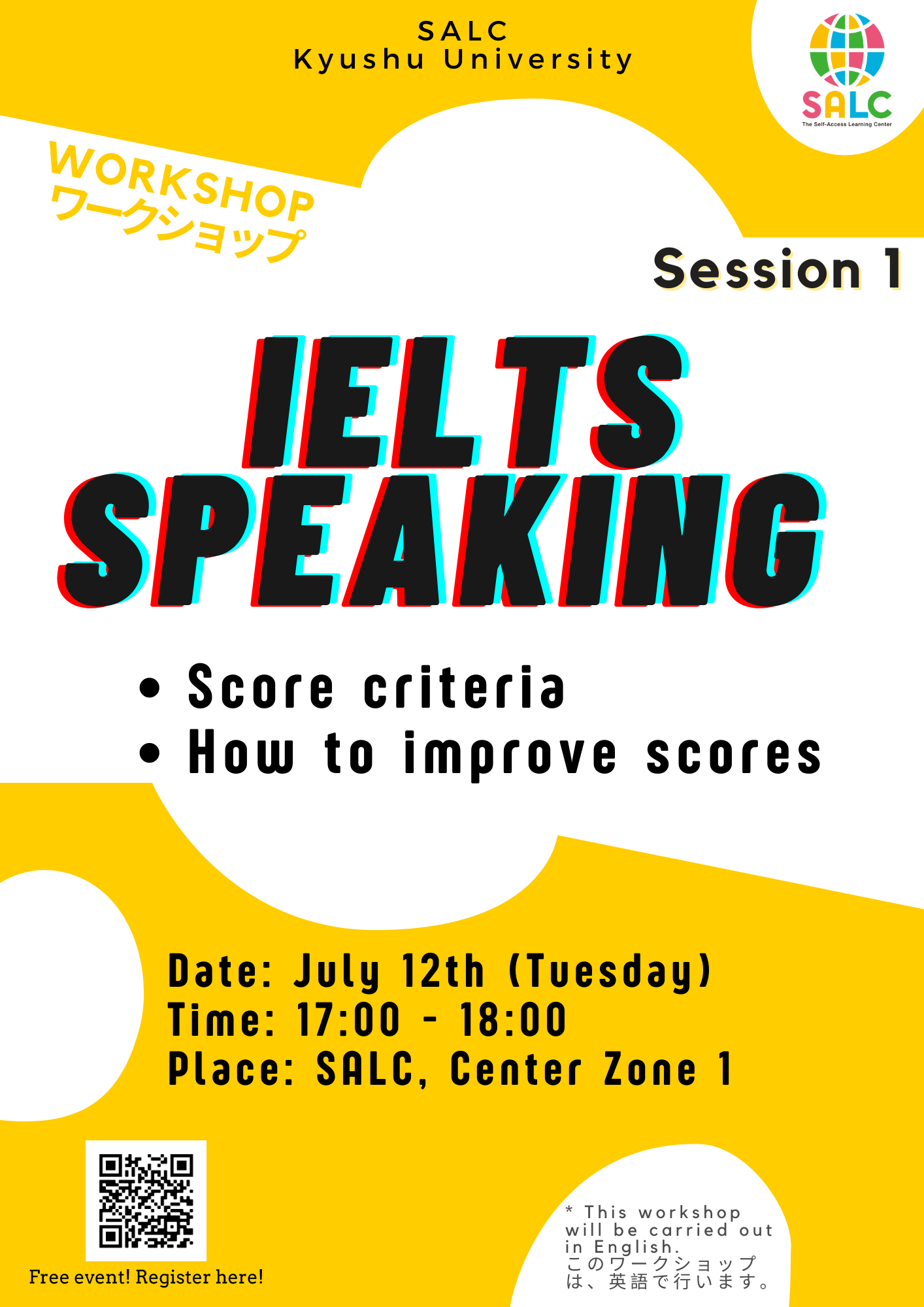 英語試験(IELTS & TOEFL iBT)準備ワークショップ(セッション1) 2022/07/11 英語試験(IELTS & TOEFL iBT)準備ワークショップ(セッション1)が明日から開催され、17時に始まります! 予約リンク: https://forms.gle/MaFTwkMGXYazwtGo6 *このワークショップは、英語で行います。