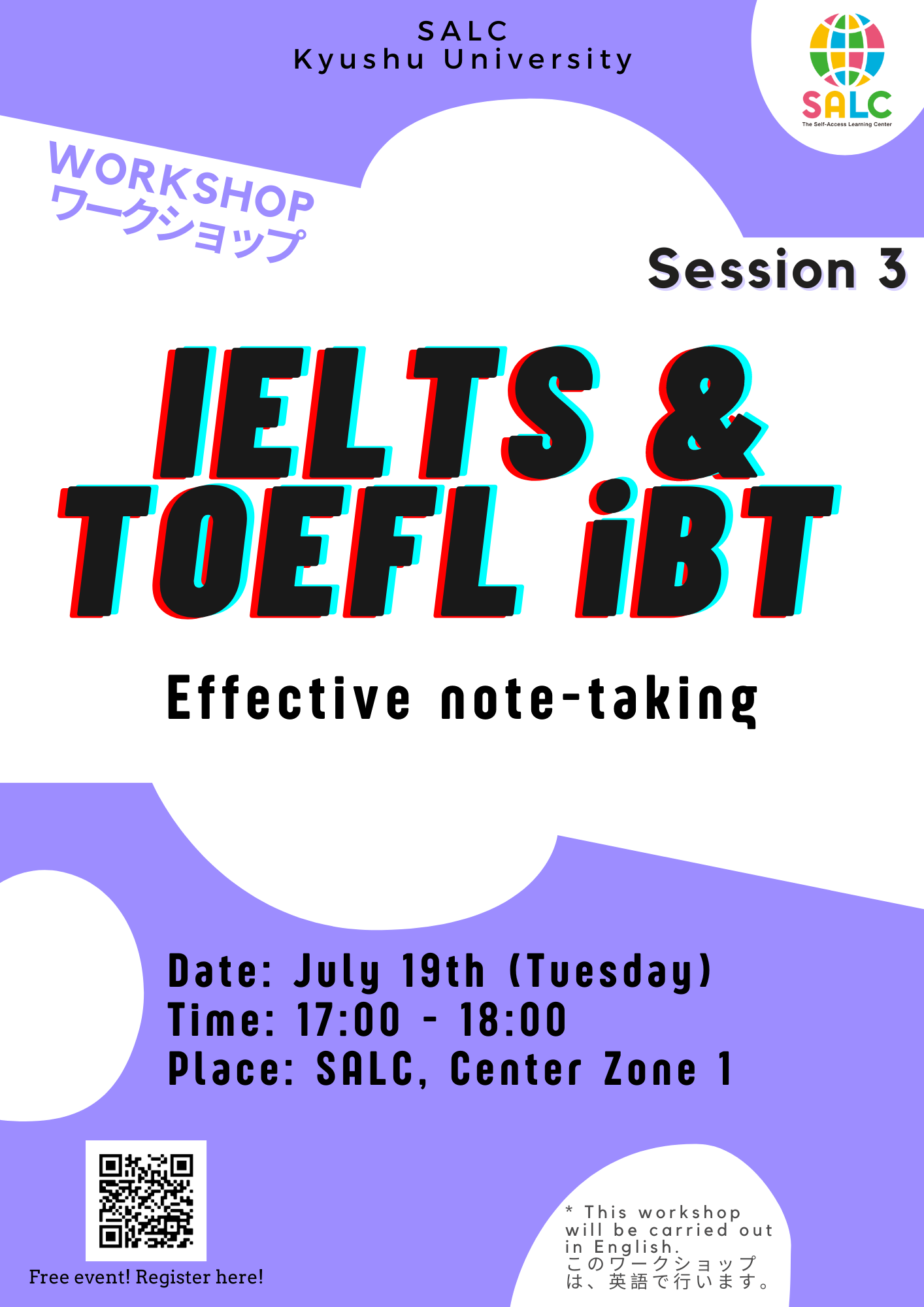 英語試験(IELTS & TOEFL iBT)準備ワークショップ(セッション3) 2022/07/18 英語試験(IELTS & TOEFL iBT)準備ワークショップ(セッション3)が明日から開催され、17時に始まります! 予約リンク: https://forms.gle/MaFTwkMGXYazwtGo6 *このワークショップは、英語で行います。