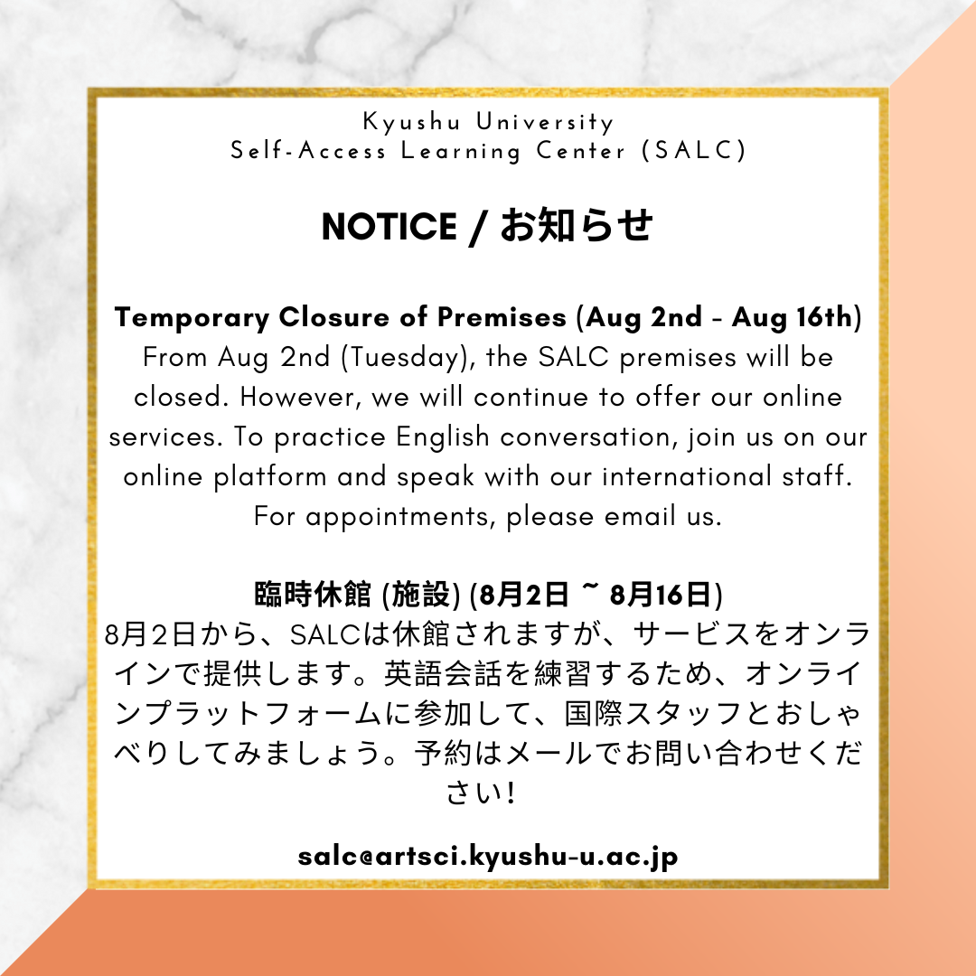 現在の新型コロナ感染状況に鑑み、SALCのサポートは8月16日までオンラインのみで実施することにします。