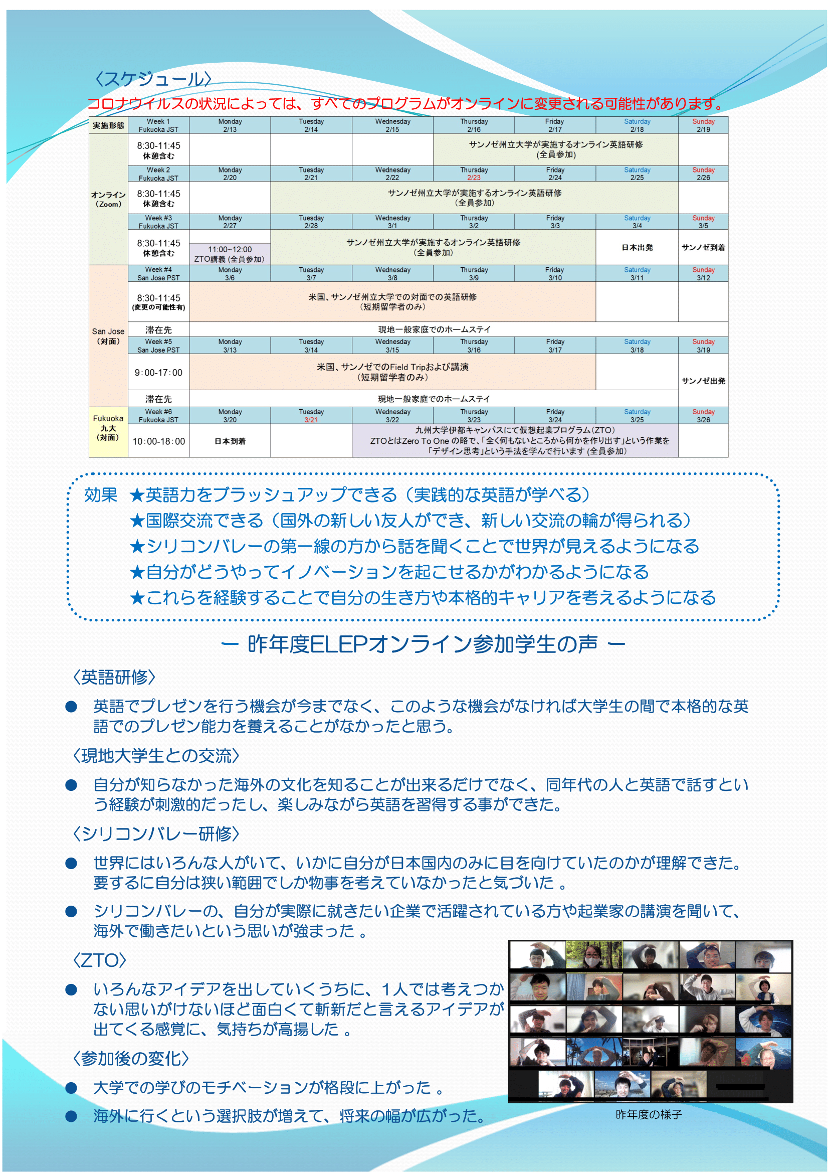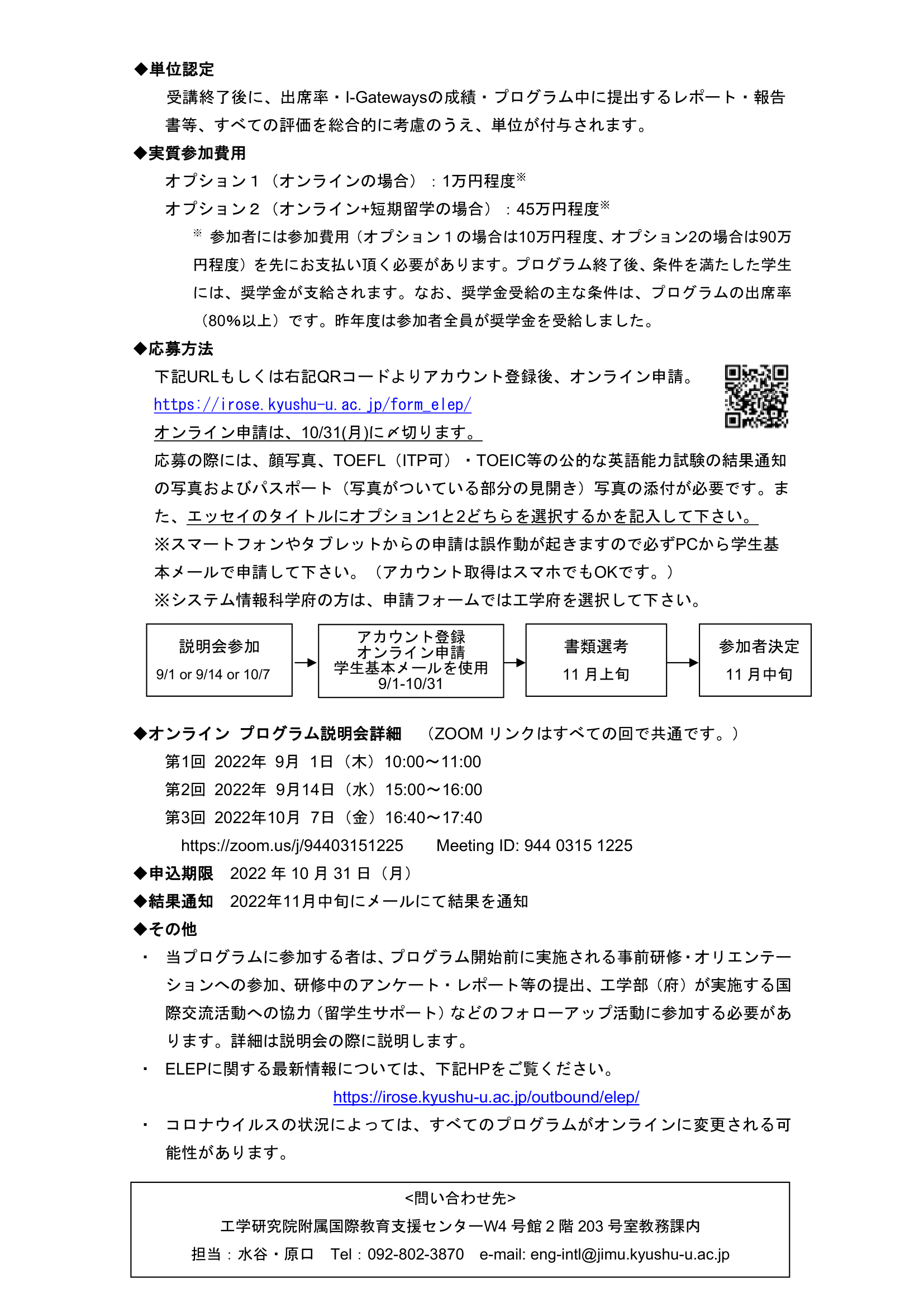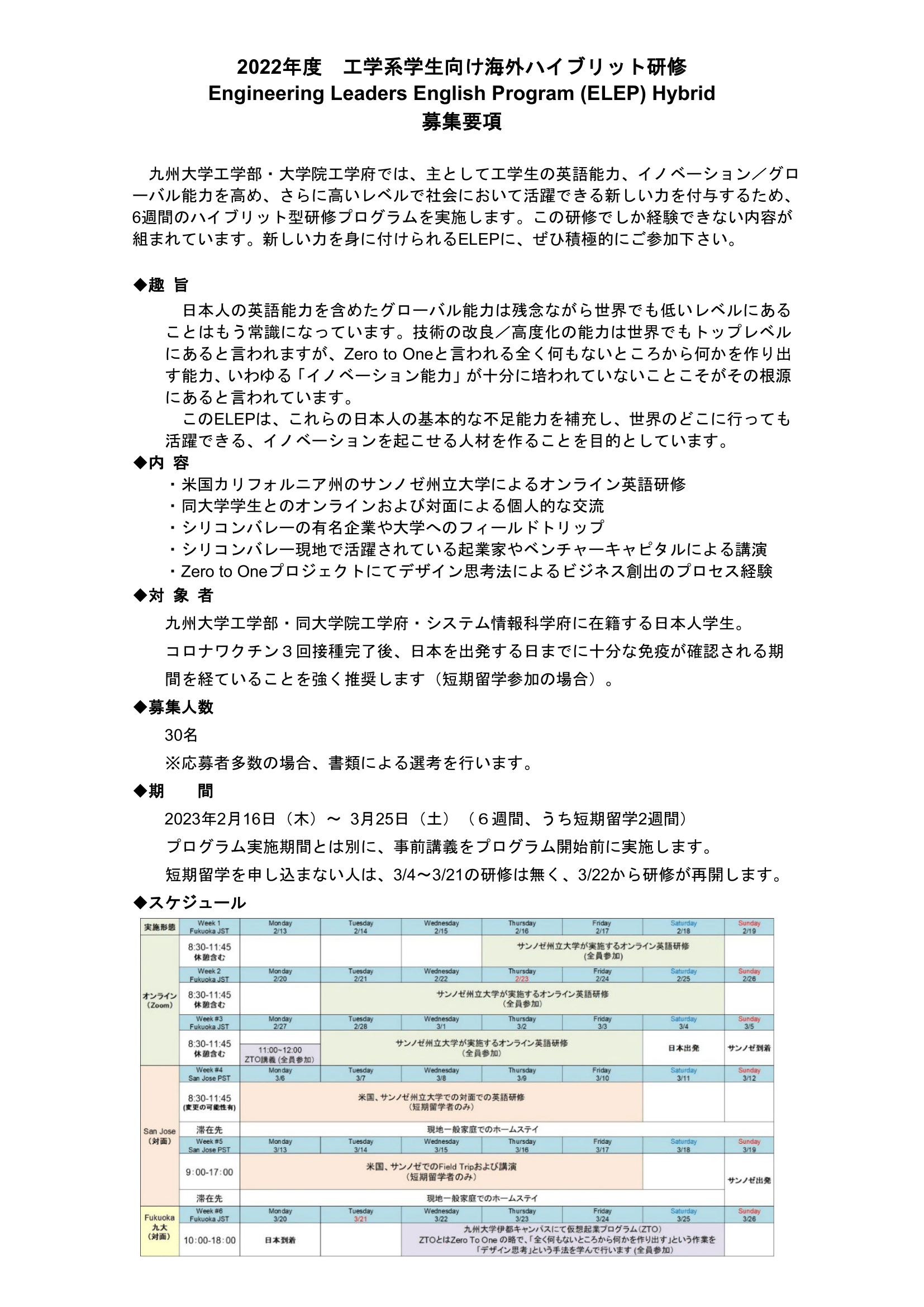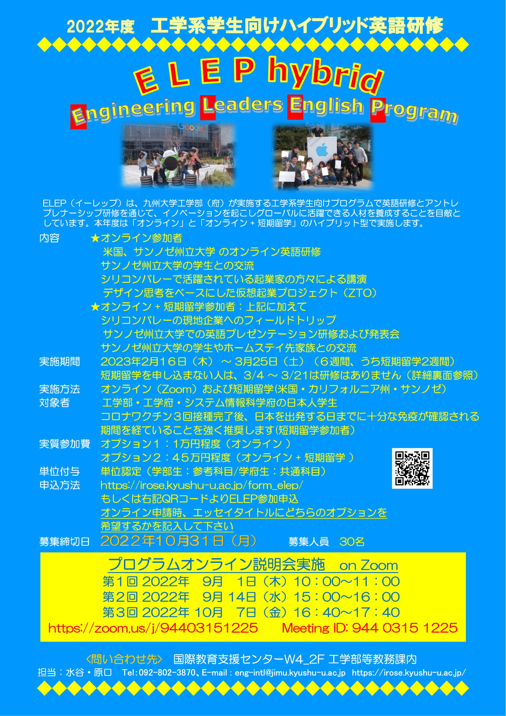 2022年度 工学系学生向け海外ハイブリット研修 参加者募集中! 2022/08/24 詳しくは、工学研究院附属国際教育支援センターのホームページをご覧下さい。( https://irose.kyushu-u.ac.jp/en/about/) ここから登録: https://irose.kyushu-u.ac.jp/form_elep/