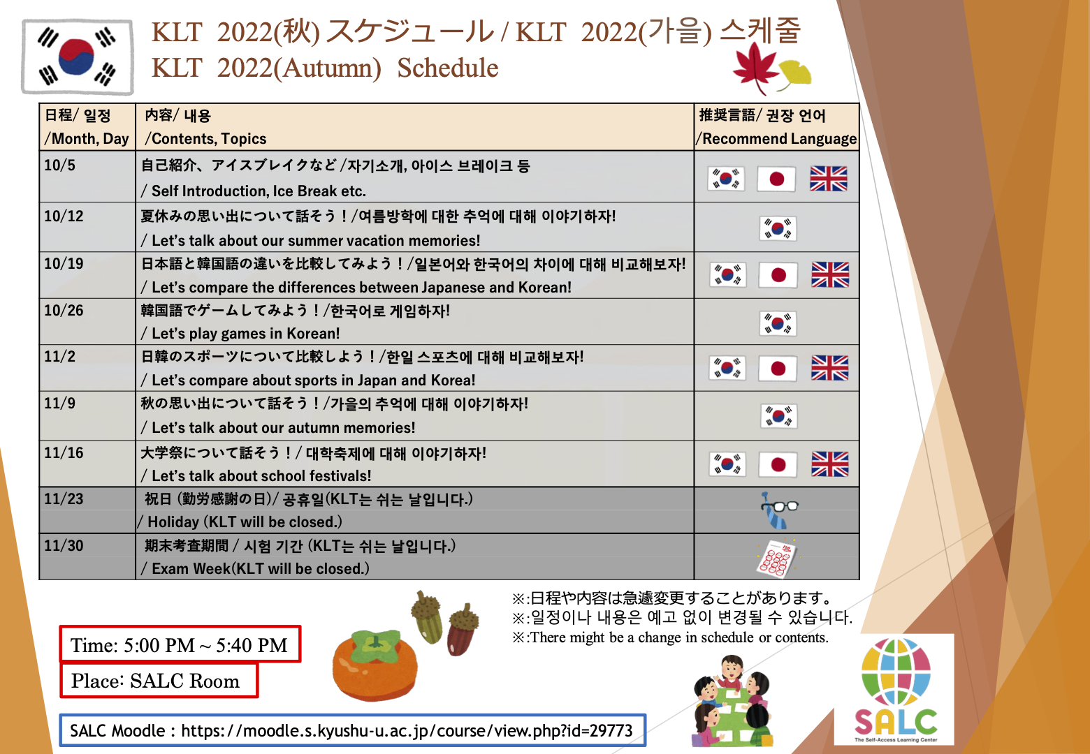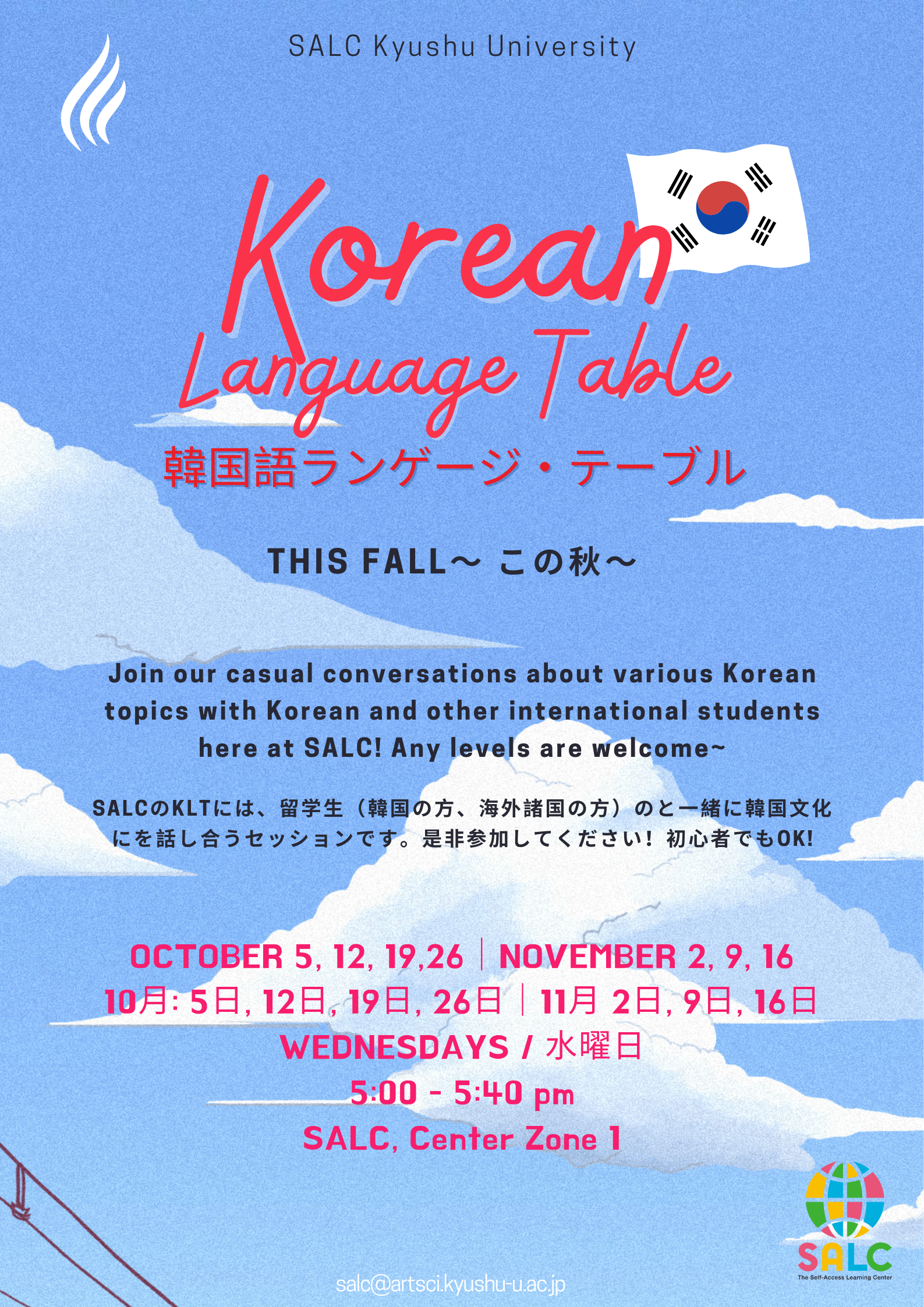 10月から11月まで、週に一回韓国語のランゲージ・テーブルを開催します!