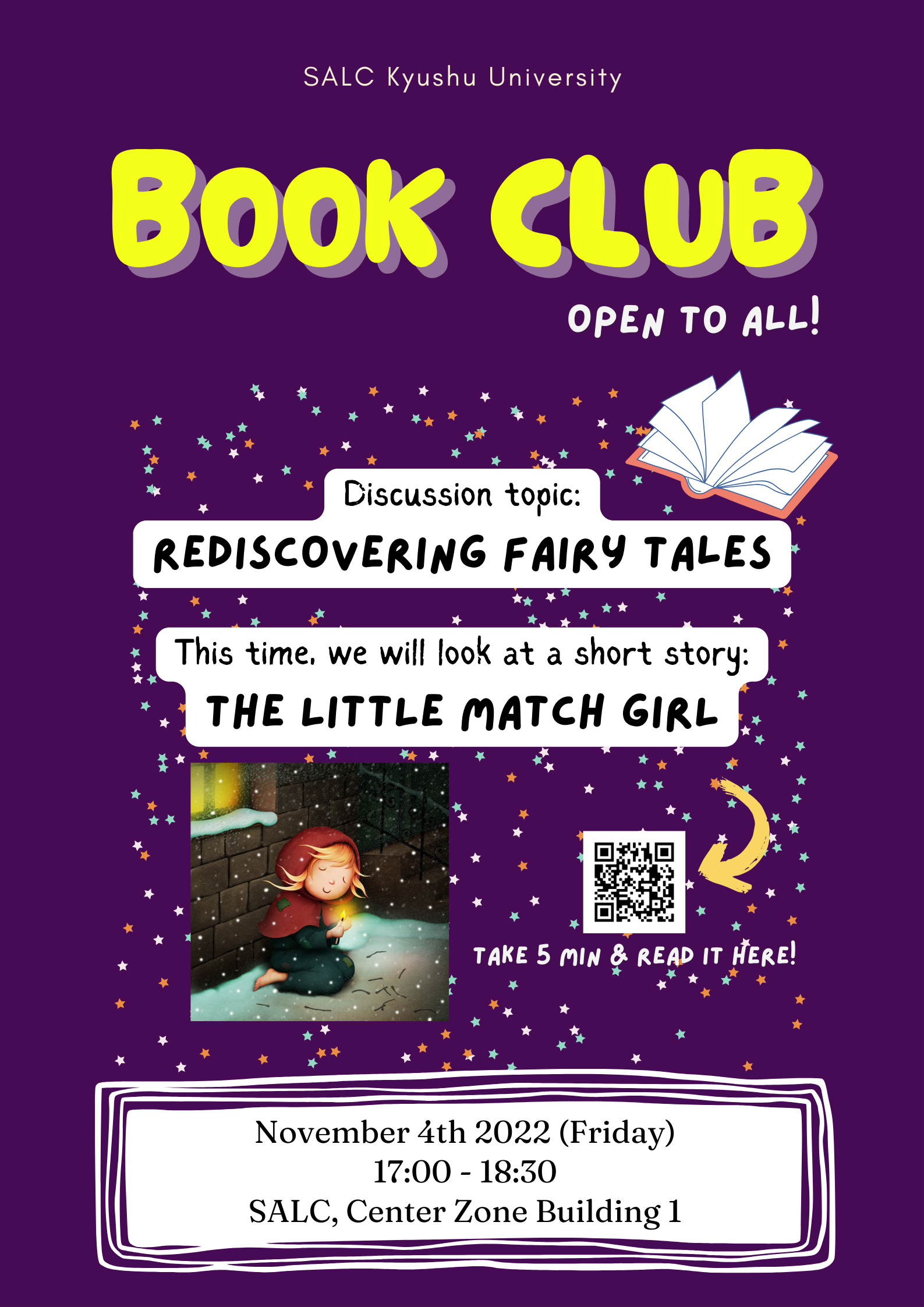 SALCブック・クラブ 2022/10/31 英語力の向上や、有名な本の討論や、そして文学についてより多く学ぶ事に興味のある方は、ぜひこのイベントに参加してください。 11月のブック・クラブに関する詳細情報は、下のポスターにあります。