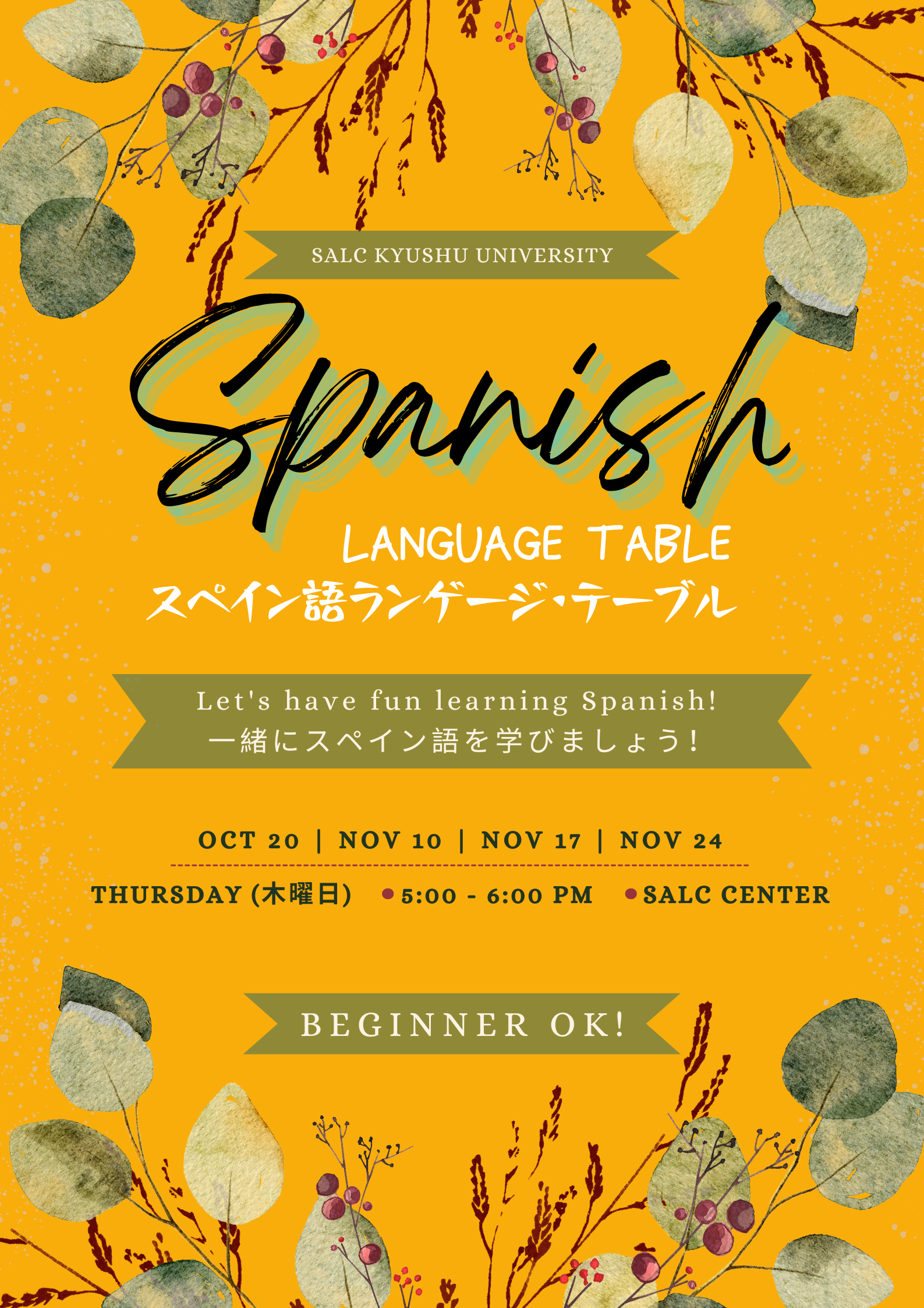 スペイン語ランゲージ・テーブル(秋学期) 2022/11/01 HOLA! スペイン語を勉強したいですか、それともスペイン語に興味がありますか? もし、あなたはスペイン語の母国語話者、母国語でチャットしたいですか? 初心者でも、上級者でも、ネイティブスピーカーでも、スペイン語でチャット(および学習)できるスペイン語テーブルに参加してください。 SALCで会いましょう!