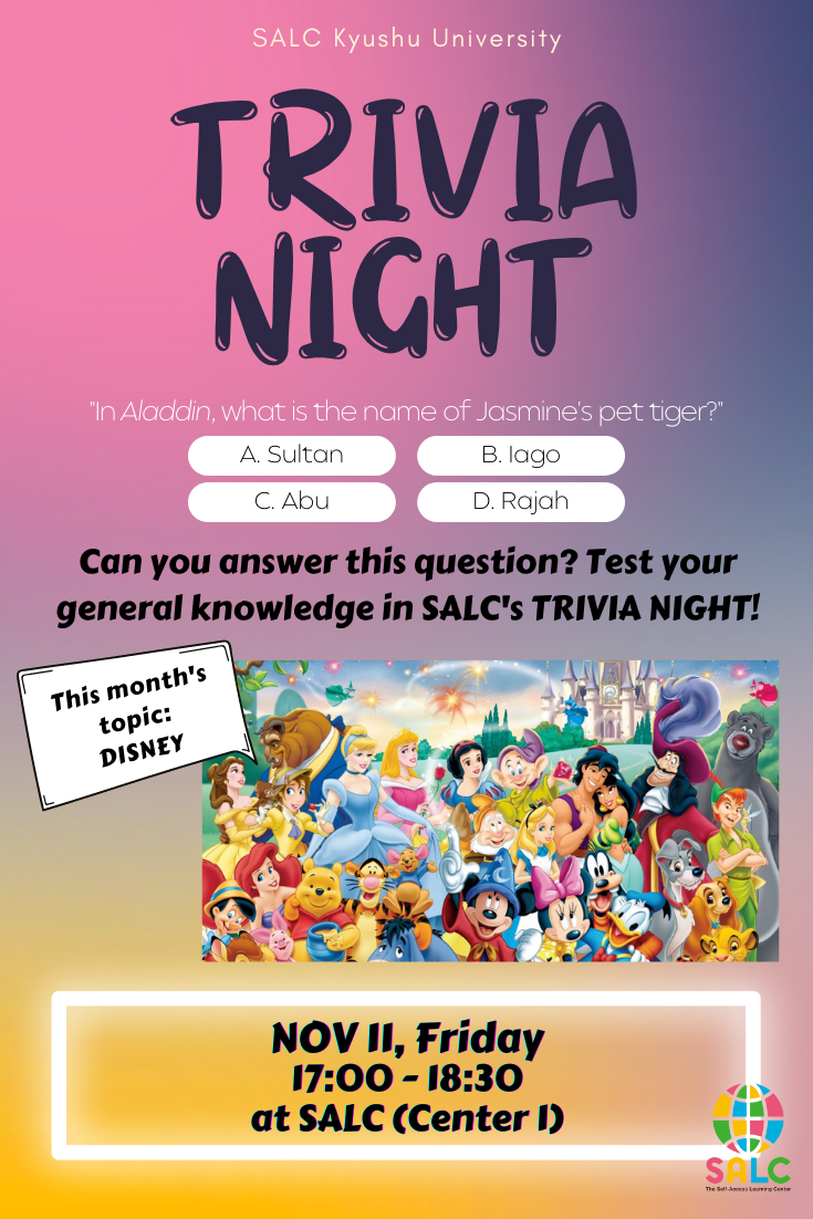 【イベント】SALCトリビアナイト 2022/11/04 ディズニーファン大募集! ディズニー映画をたくさん見ていますか? 11月11日(金)に開催されるこのイベントでは、ディズニーに関する知識をクイズゲームしながら、仲間を作りましょう。 参加者はチームを分けて、ゲームを進み、優勝のチームには景品があります! 一人でも、お友達を連れても、誰でも参加できます。 皆様のご参加をお待ちしております。