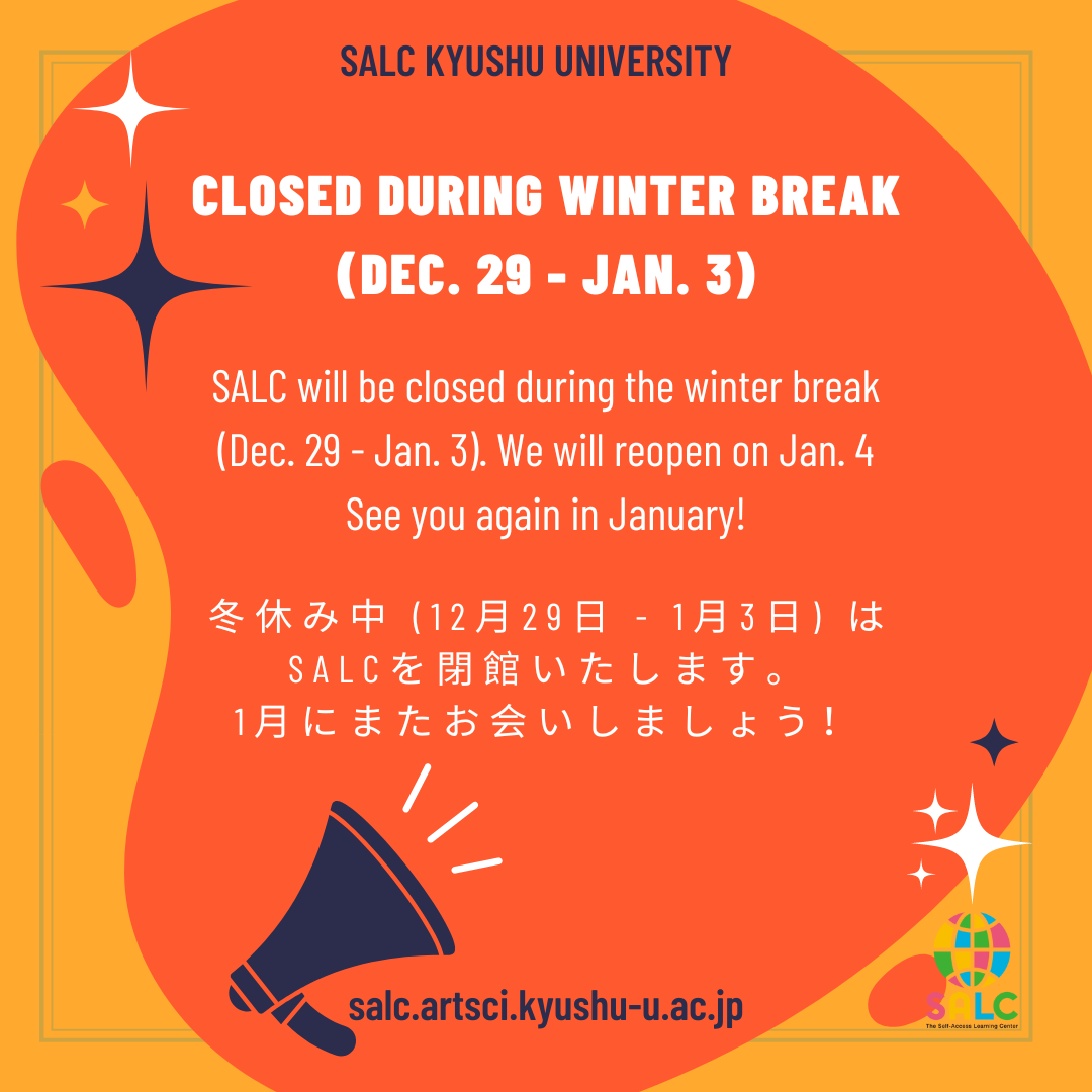 【お知らせ】冬休み 2022/12/28 冬休み期間中 (12月29日 – 1月3日) はSALCを閉館いたします。 もしご不明な点がございましたら、お気軽にお問い合わせください。 1月にまたお会いしましょう!