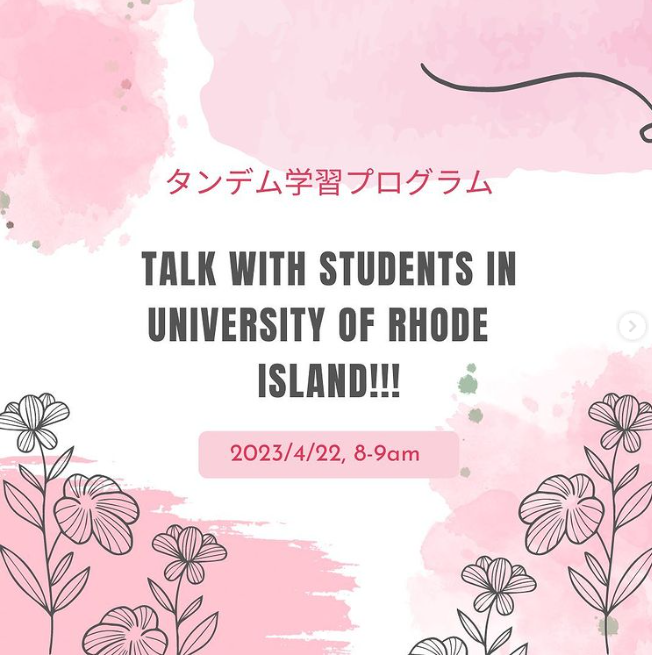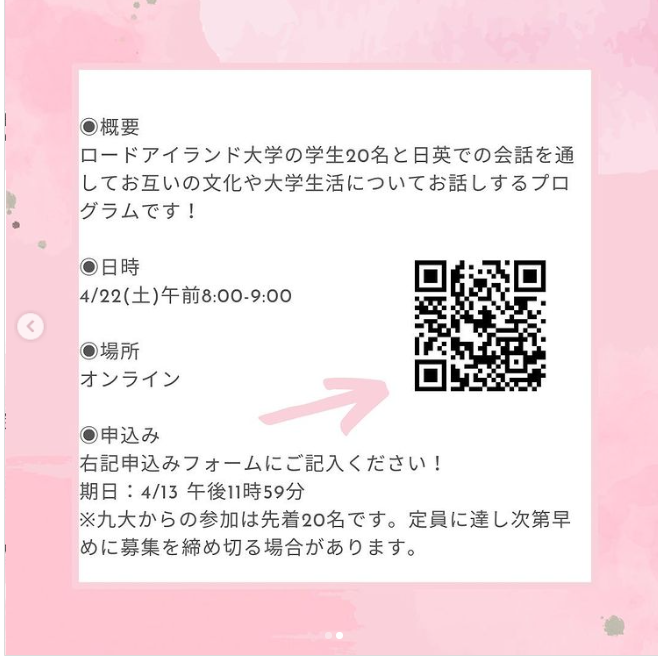 ロードアイランド大学の学生とお話ししよう! 2023/04/17 Deadline extended to April 20th! 4月ですね!新しいことを始めてみたい、英語を頑張りたい、という九大生のみなさんへお知らせです☺︎☺︎ 九州大学では、九大と協定を結んでいるロードアイランド大学の学生20名とオンラインでお話しするイベントを開催します。日本語に興味を持っている海外大生、少人数、1時間のみ、オンライン開催、ということもあり気負わず気軽にご参加いただけます! 下記詳細を確認の上、ぜひご参加ください 時間:4/22 午前8:00-9:00 場所:オンライン 対象:全九大生(新1年生、院生、留学生含む) 申込み:フォーム(画像QRコードまたはハイライトリンクより)提出 4/20 午後11:59締切ですが、先着順のため早めに締め切る可能性があります!