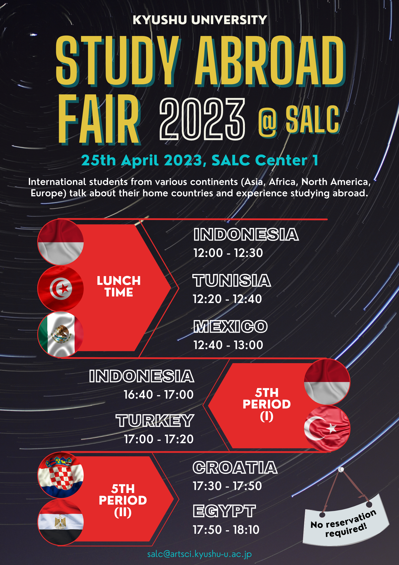 久しぶりに、SALCが九州大学留学フェアに出展致します。今回の留学フェアでは、世界諸国から九大に留学しているSALCのTAたちから、彼らの自国文化及び留学経験を皆様にシェアし、複数のセッションを用意しております。異なる文化を体験するために留学することを考えていたり、あるいは今後的に外国の大学院に進学希望する方が、このチャンスをお見逃しなく!詳しくはポスターにご参考ください。