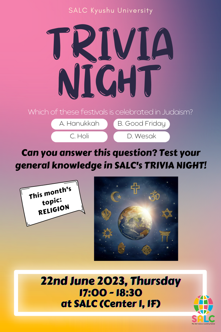 【イベント】SALCトリビアナイト 2023/06/12 参加者はチームを分けて、ゲームを進み、優勝のチームには景品があります! 一人でも、お友達を連れても、誰でも参加できます。 皆様のご参加をお待ちしております!