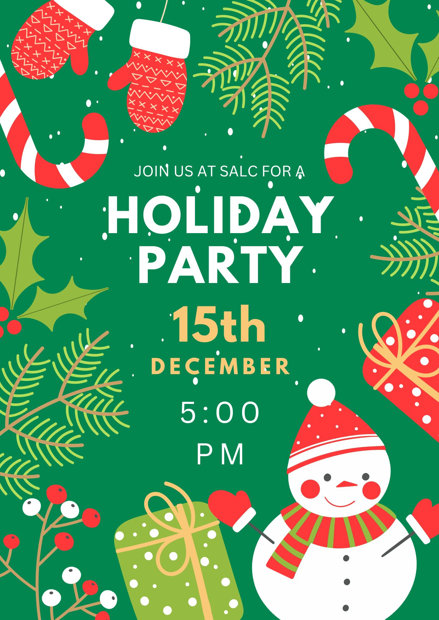 SALCクリスマスパーティー(12月15日開催) 2023/12/12 SALCクリスマスパーティー!!! 日付:12月15日(今週の金曜日) 時間:午後5時〜午後7時 これは楽しい季節です!一緒に私たちのクリスマスパーティーでホリデースピリットを祝いましょう。 アクティビティ: クリスマスツリーの飾り付け 賑やかなクリスマス音楽を聴く 楽しいホリデークラフトを試す おいしいおやつを楽しむ 温かくて居心地の良いホットチョコレートを楽しむ 笑顔と歓声に満ちた楽しい夕べの準備をしましょう!ホリデーマジックを見逃さないでください。お会いできることを楽しみにしています! このプロモーションをイベントの詳細やブランディングにカスタマイズしてご利用いただき、さらに魅力的にするために関連するハッシュタグとイメージをご活用ください。ハッピーホリデー! #クリスマスパーティー #ホリデーチア #祝祭の楽しみ