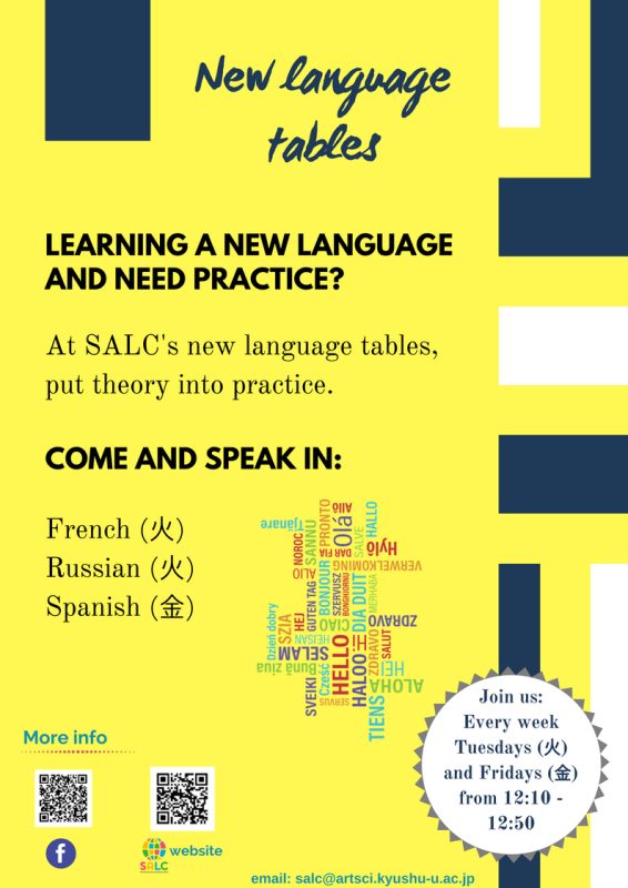 SALCでは、英語以外の言語でも話す機会があることを知っていますか? SALCでは韓国語と中国語のランゲージテーブルもが毎週1回昼食時に開かれていますが、この度、皆さんが下記の言語についても練習できるようにランゲージテーブルを拡張します。
