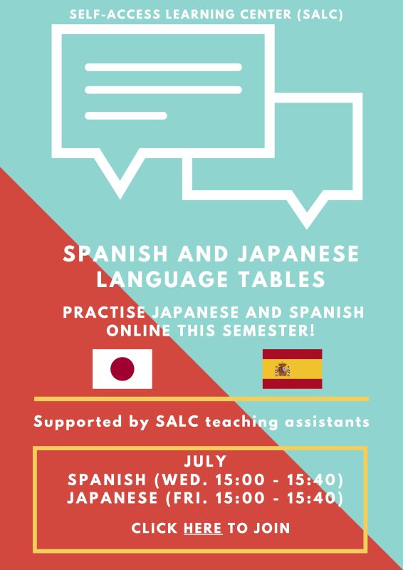 Did you know that you can practice speaking languages other than English in SALC? This semester, SALC will run a Japanese and Spanish language tables once a week. The events will be supported by SALC teaching assistants.