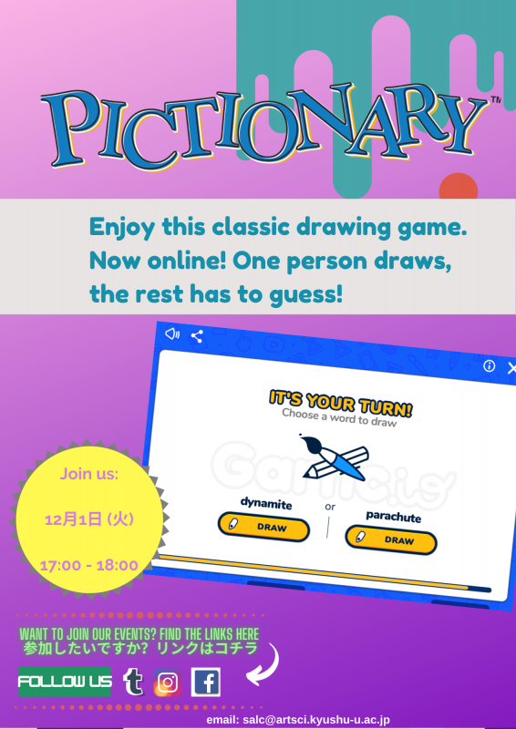 SALC – Pictionary – December 2012 November 26, 2020 Practice your English with this fun word-guessing game! Check-out the poster below if you are interested in joining! The link and password can be found on our Moodle page! https://moodle.s.kyushu-u.ac.jp/course/view.php?id=29773