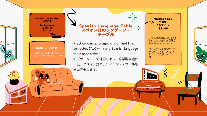 Practice your language skills online! This semester, SALC will run a Spanish language table once a week. Link: https://moodle.s.kyushu-u.ac.jp/course/view.php?id=29773