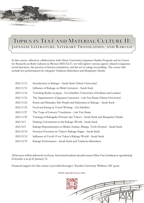 Kyushu University’s International Master’s Program (IMAP) is currently holding a series of lectures focusing on literature, literary translation, and rakugo. Please check out the poster if you are interested in participating.